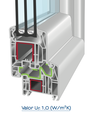 • Refuerzo de Acero: con tratamiento antioxidante en todos los perfiles. Posibilidad de perfiles de refuerzo de fibra de vidrio para mejorar la trasmitancia térmica, consiguiendo un mayor aislamiento.